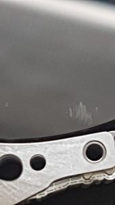 Gambar di atas membuat data recovery terhalang. Semua gambar ini diambil di dalam ruangan steril. Langkah pertama dilakukan pembersihan. Langkah kedua apabila bercak di atas media platter berhasil dibersihkan (harap2 bagian bawah platter gk ada masalah) akan dilakukan proses lanjut untuk data recovery pada harddisk ini.